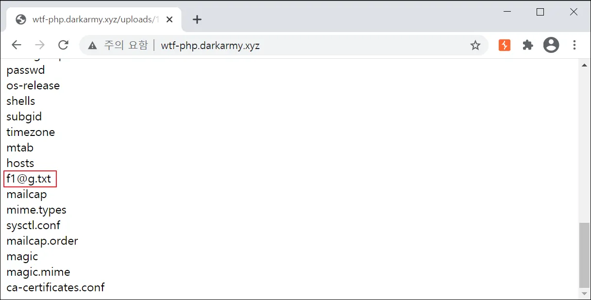 업로드한 파일에 접속하면 f1@g.txt 파일에 작성된 Flag를 확인할 수 있다.