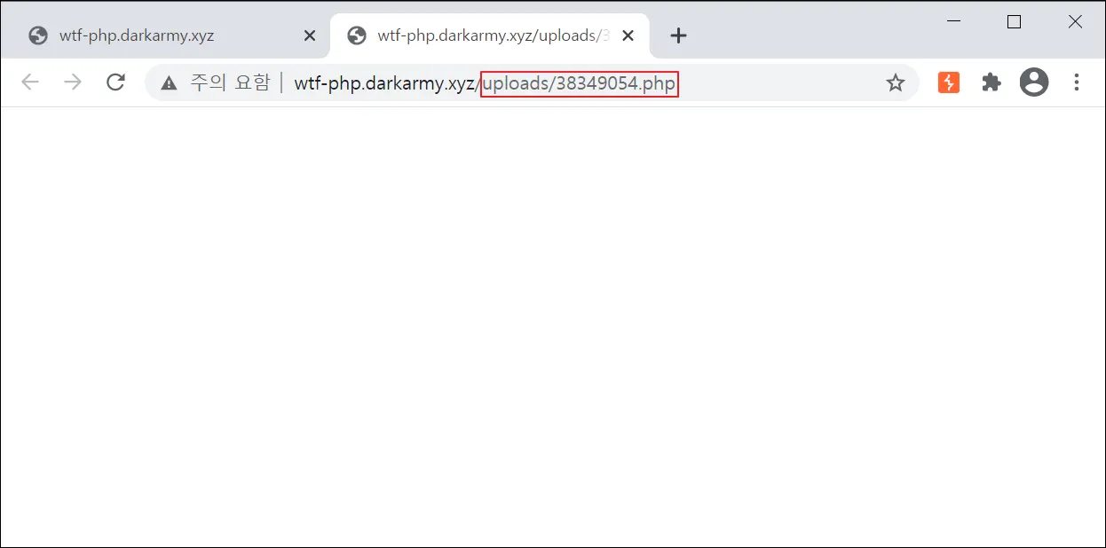 우선 파일 확장자에 대해 필터링을 하지는 않는 것 같다. 이후 File 링크를 클릭해서 접속하였지만, 업로드한 웹 쉘이 동작하지 않고 빈 화면만 출력하는 모습을 확인할 수 있었다.