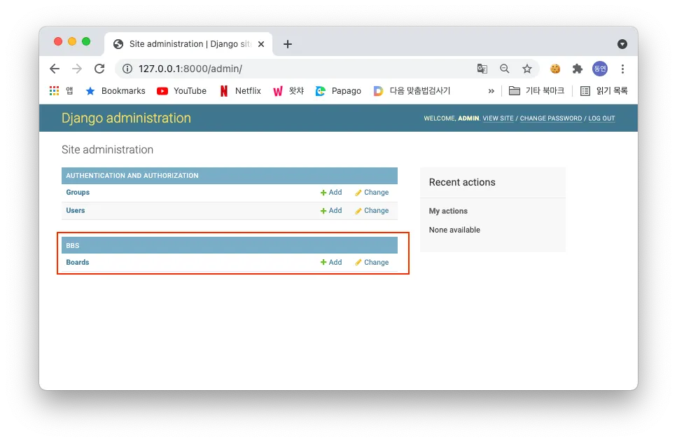 일반적으로 바로 접속 시, 우리가 생성했던 bbs앱의 모델을 확인할 수 없다.