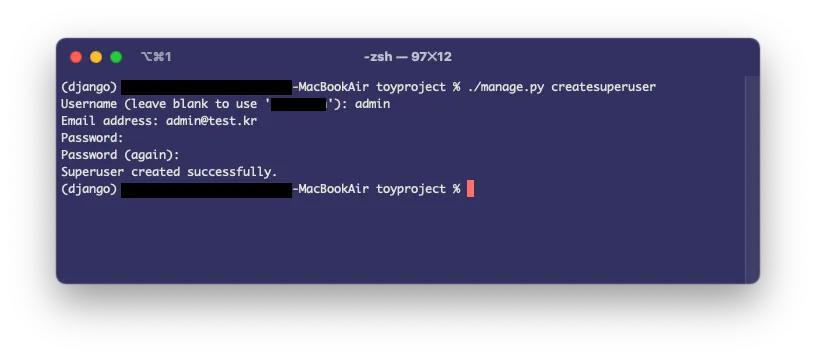 manage.py 파일과 createsuperuser 를 사용하여 어드민 계정을 생성해준다.
