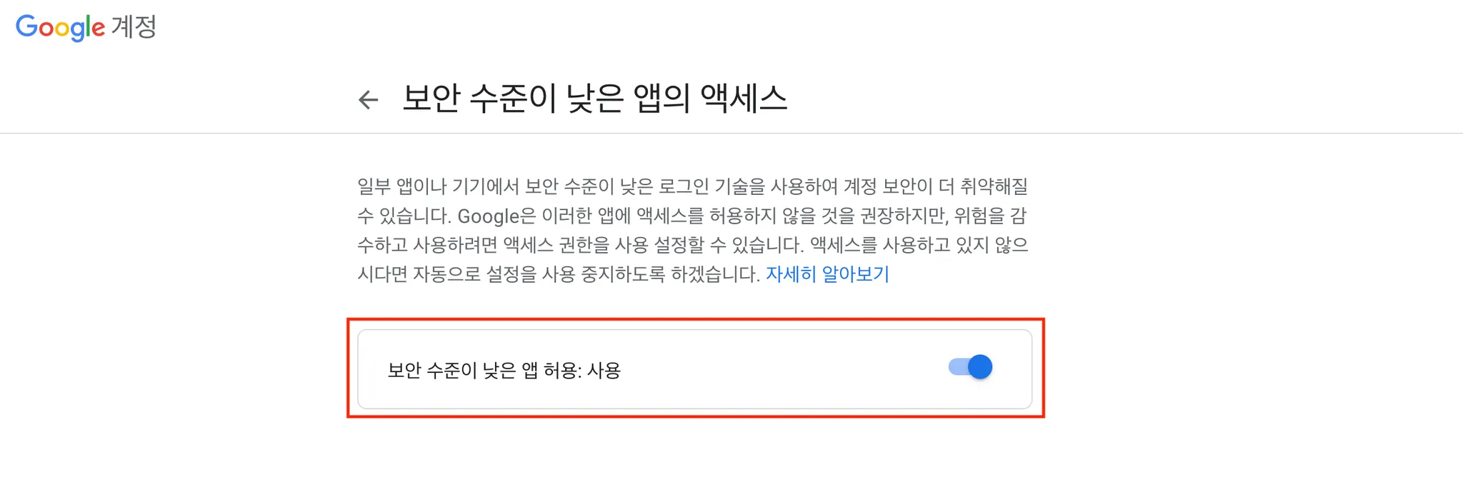보안 수준이 낮은 앱 허용 옵션을 아래와 같이 사용 으로 만들어준다.