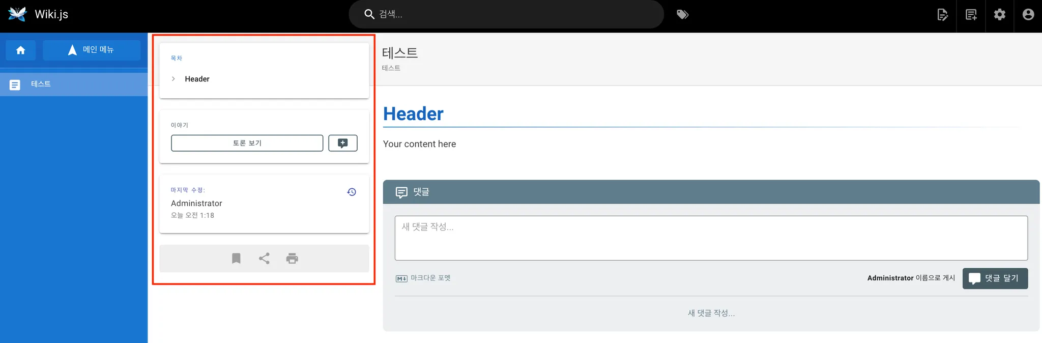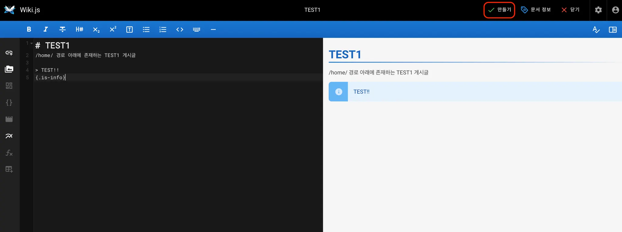 최초로 만든 페이지(테스트 페이지)는 /home 경로이다. Wiki.js의 게시글 작성 시 경로를 직접 설정하여 진행하는 방식이다.