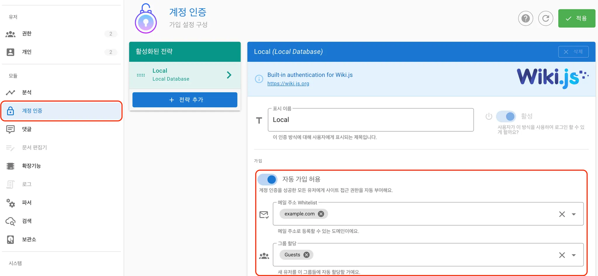 사용자가 WIKI에 가입 시 자동으로 가입이 허용되도록 만들어주는 설정이다. GITHUB, SLACK 등 여러 플랫폼을 사용하여 인증을 설정할 수 있다.