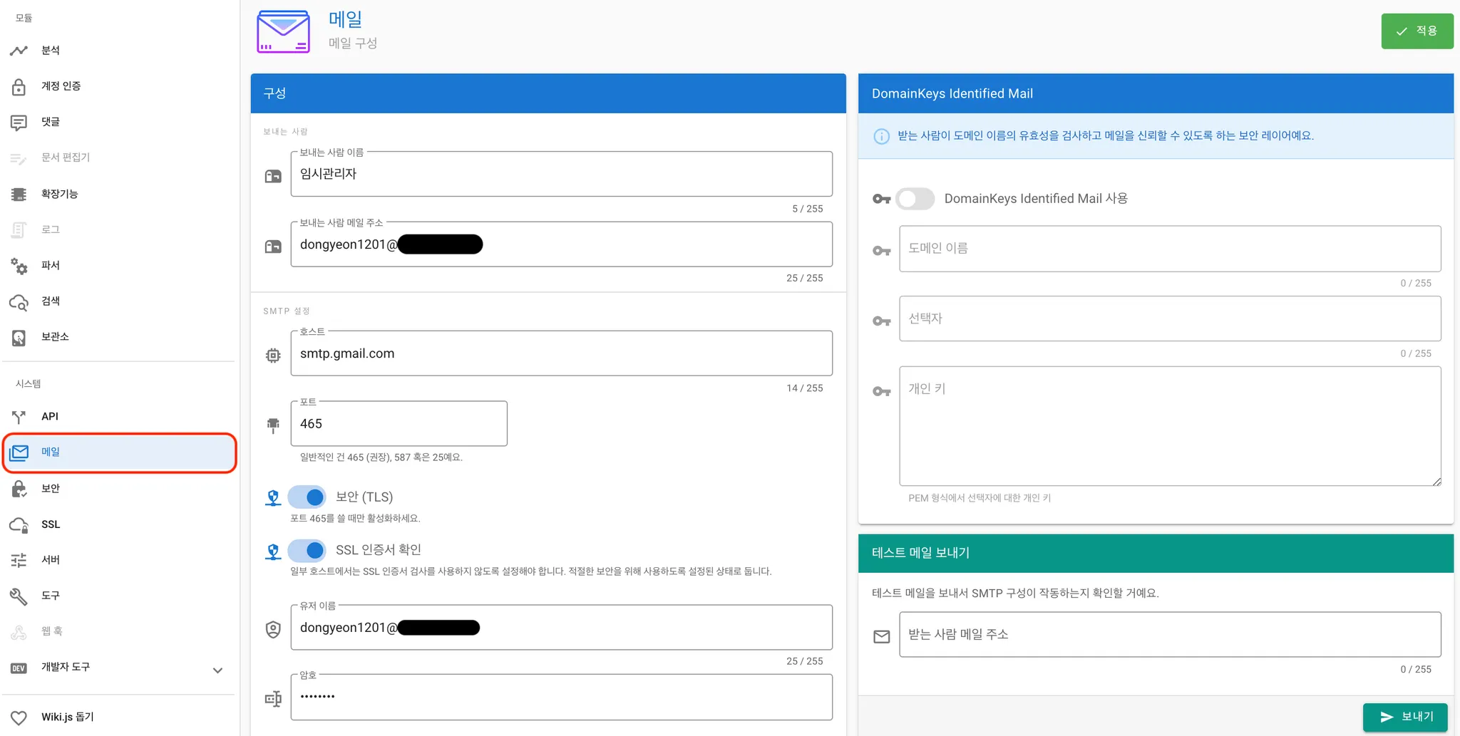 3. 새로운 사용자에게 계정 활성화 메일 등을 전송하기 위해 wiki.js 설정에서 SMTP 설정을 진행해주어야 한다.
