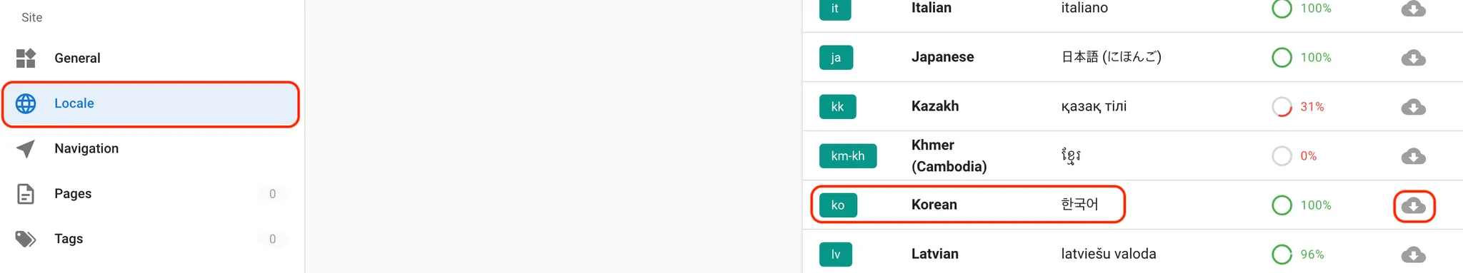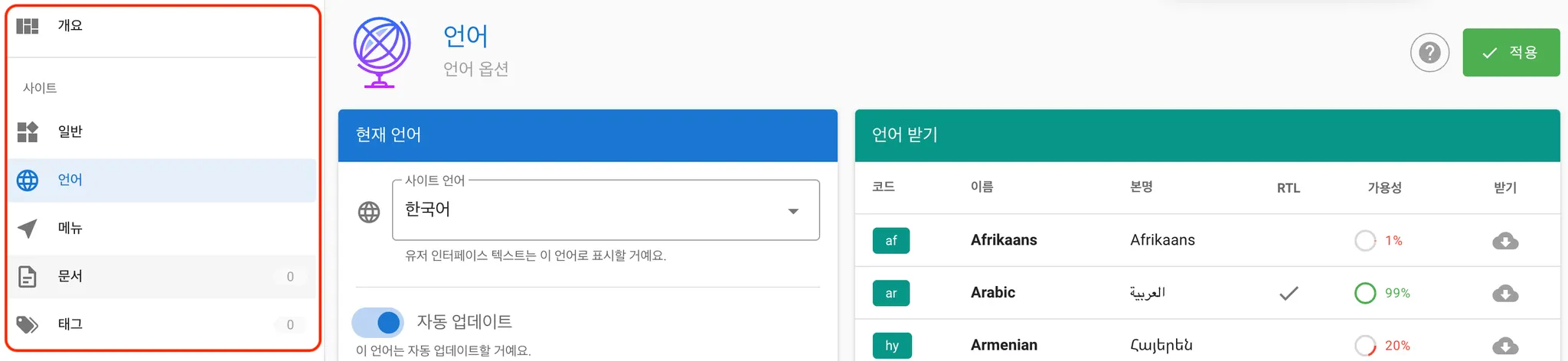 언어 메뉴에서 한국어 언어팩을 다운 받은 후 기본 언어를 변경할 수 있다.
