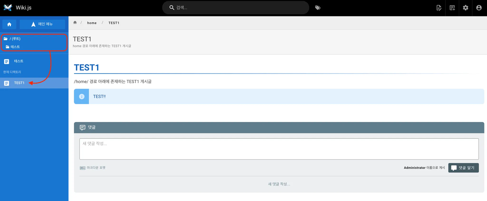 예시로 테스트 게시글 아래에 새로운 게시글을(/home/TEST1)을 작성한다. 이렇게 진행하게 되면 아래와 같은 구조가 된다.