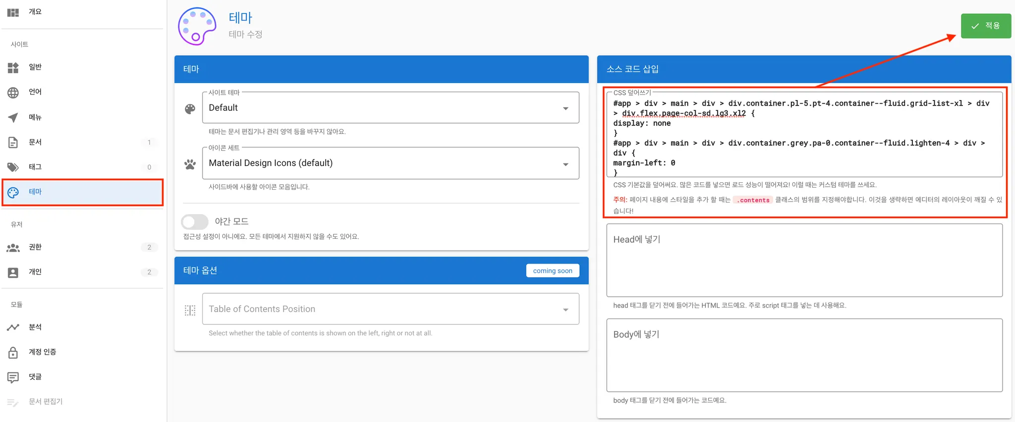 해당 부분이 거슬리면 설정의 테마 → 소스코드 삽입 에 해당 부분이 보이지 않도록 소스코드를 삽입해준다.