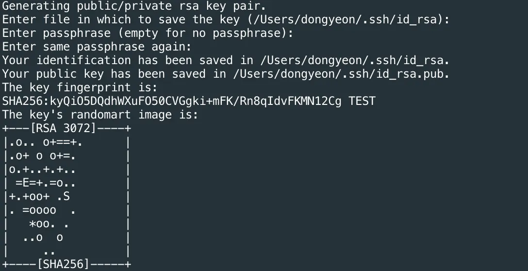 Enter file in which to save the key : 개인키가 저장되는 위치 (기본 값 - ~/.ssh/)