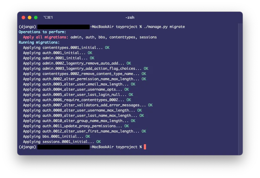 /toyproject/settings.py 에서 사용할 DB의 설정과 우리가 생성한 게시판 앱(bbs)를 등록해줘야 한다.