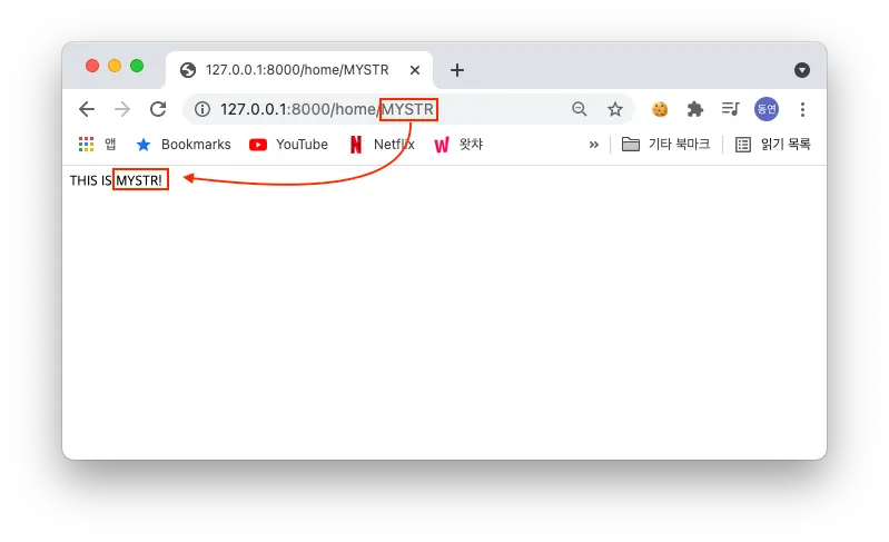 # urls.py에서 적용한 str 키워드 값이 home 핸들러의 인자로 사용되며, 해당 값을 반환메세지에 적용