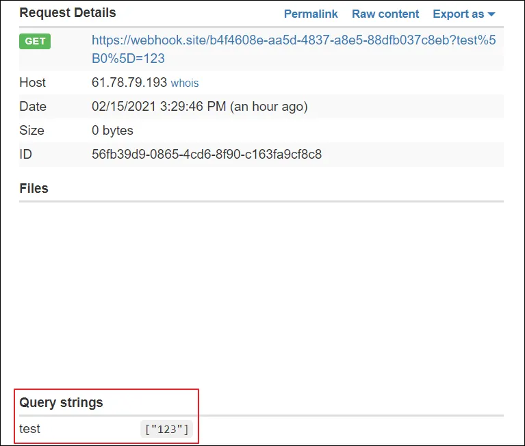 ?test[]=123 으로 요청할 경우 ["123"] 으로 값이 넘어오는것을 확인할 수 있다.