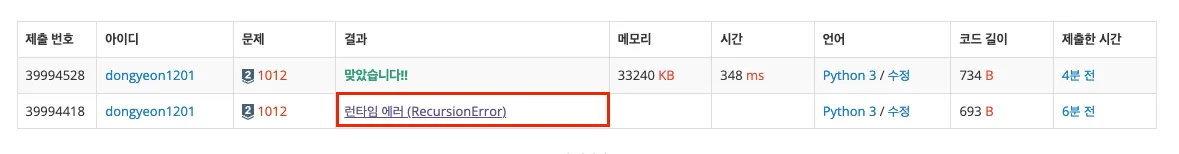 백준에서 작성한 에러 관련 내용을 살펴보면 백준의 채점 서버에서 정한 기본적인 재귀 깊이는 1000이기 때문에, 그 이상 재귀를 사용하게 되는 예시는 에러를 뱉는다고 한다.