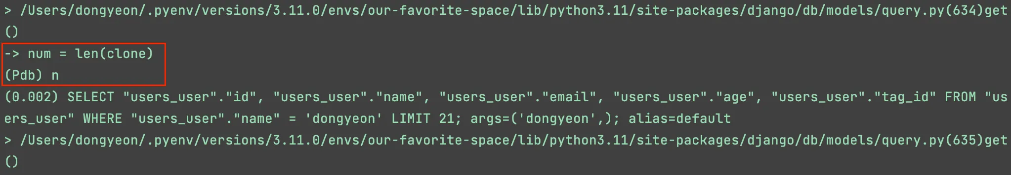 위에서 확인한 get 의 간단한 동작은 또 다른 QuerySet 객체를 Clone하여 필터링 및 order_by 설정 후 쿼리를 동작하는 방식인 것 같다.